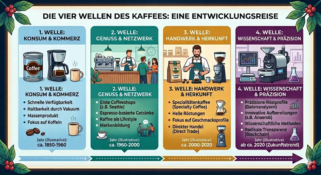 Die Kaffeewelt ist ständig in Bewegung. Von der Massenproduktion der First Wave über die Qualitätsrevolution der Second Wave bis hin zur handwerklichen Präzision der Third Wave hat sich Kaffee immer weiterentwickelt. Doch inzwischen zeichnet sich eine neue Phase ab: die Fourth Wave of Coffee. Aber was bedeutet das konkret?